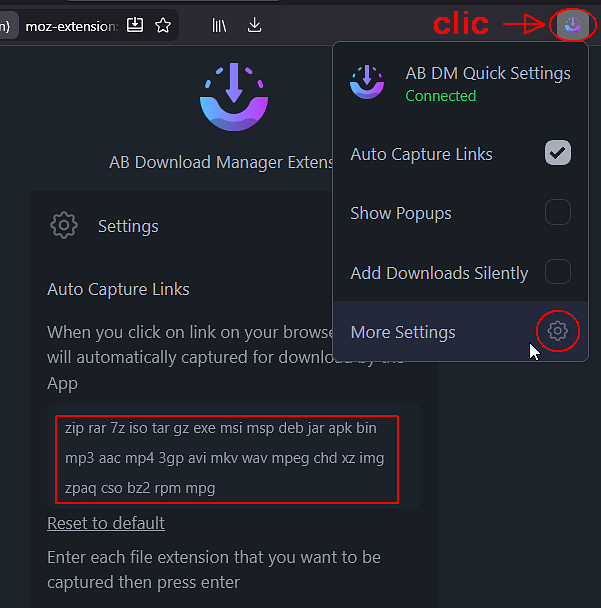 Después de instalar la extensión en un navegador web, haga clic en el icono de la extension y configúrela. Agregue todos los tipos de archivo que ve en el ejemplo: zip rar 7z iso tar gz exe msi deb jar apk bin img cso chd zpaq xz bz2