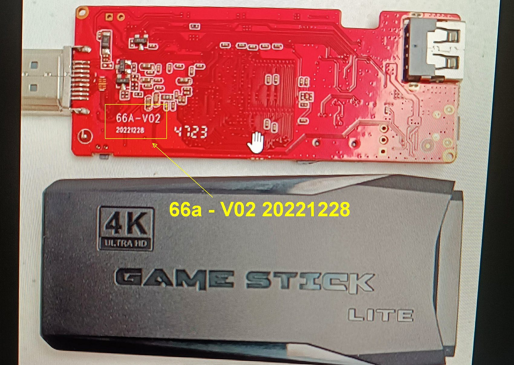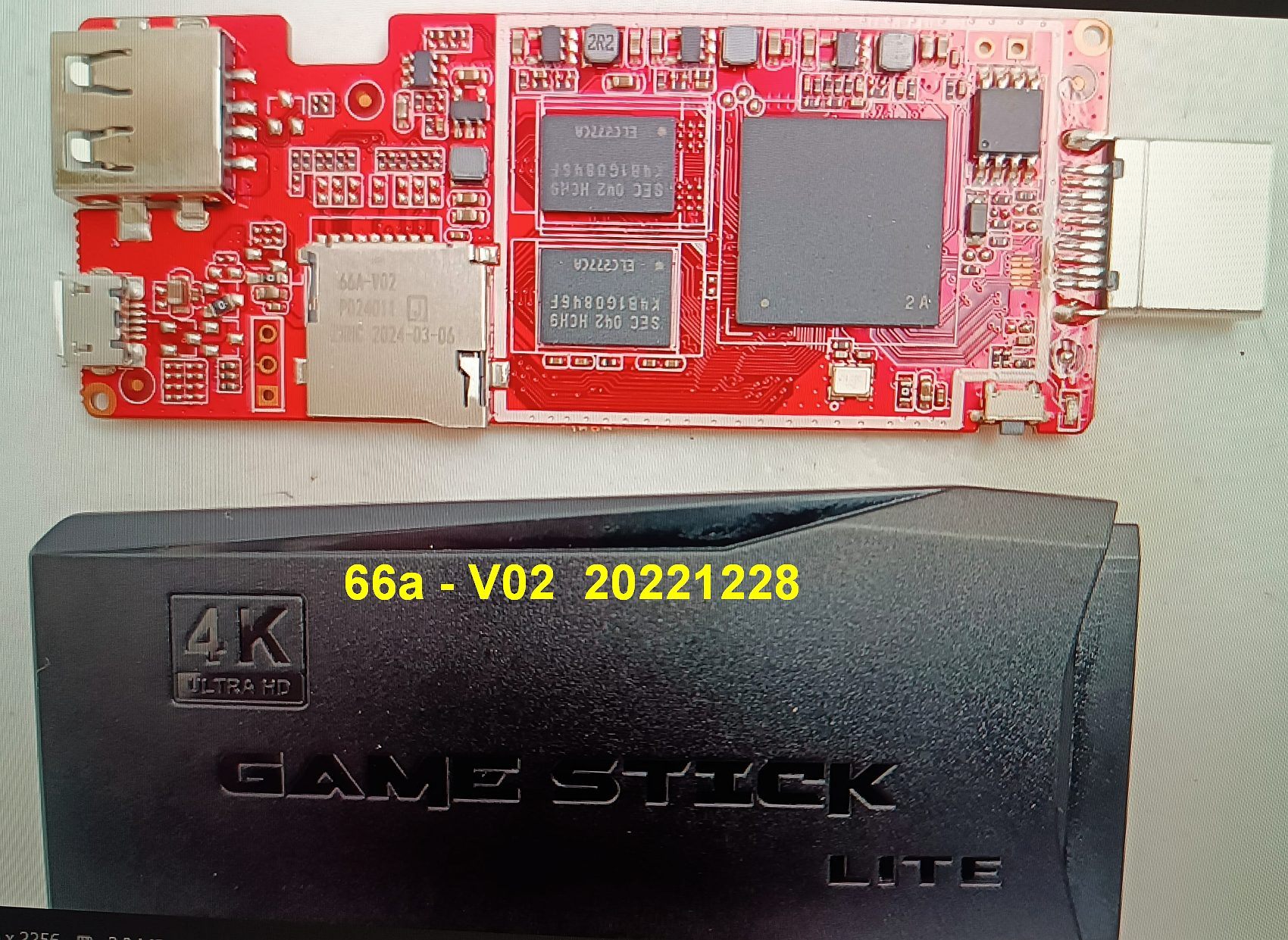 66A V02 20221228, SEGAM M8 V5.0 UI 2023, restaurar game stick lite 4k, tutorial. La placa es roja pero el chip primario no está etiquetado ni se conoce. Las marcas en la parte trasera de la placa son 66A V02 20221228. Es posible que la parte delantera no tenga ninguna marca (texto). Vea mis fotos adjuntas aquí (abajo) y si su placa es diferente, puede publicar su mensaje y foto en la sección "Ayuda general" del foro, o contáctame por correo.