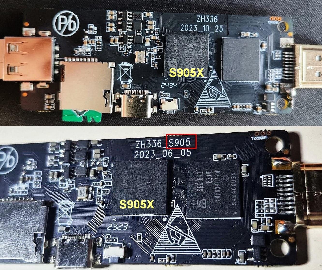 ZH336 S905 S905X 2023 06 05 or 2023 10 25 gorilla ( gorila ) X2 3D 4K game stick, tutorial para restaurar. Las placas son negras y similares, pero tienen diferentes fechas impresas en ellas. El chip principal es un Amlogic S905X. Suele ser equivalente a un S905L. El DTB sería un gxl p281.